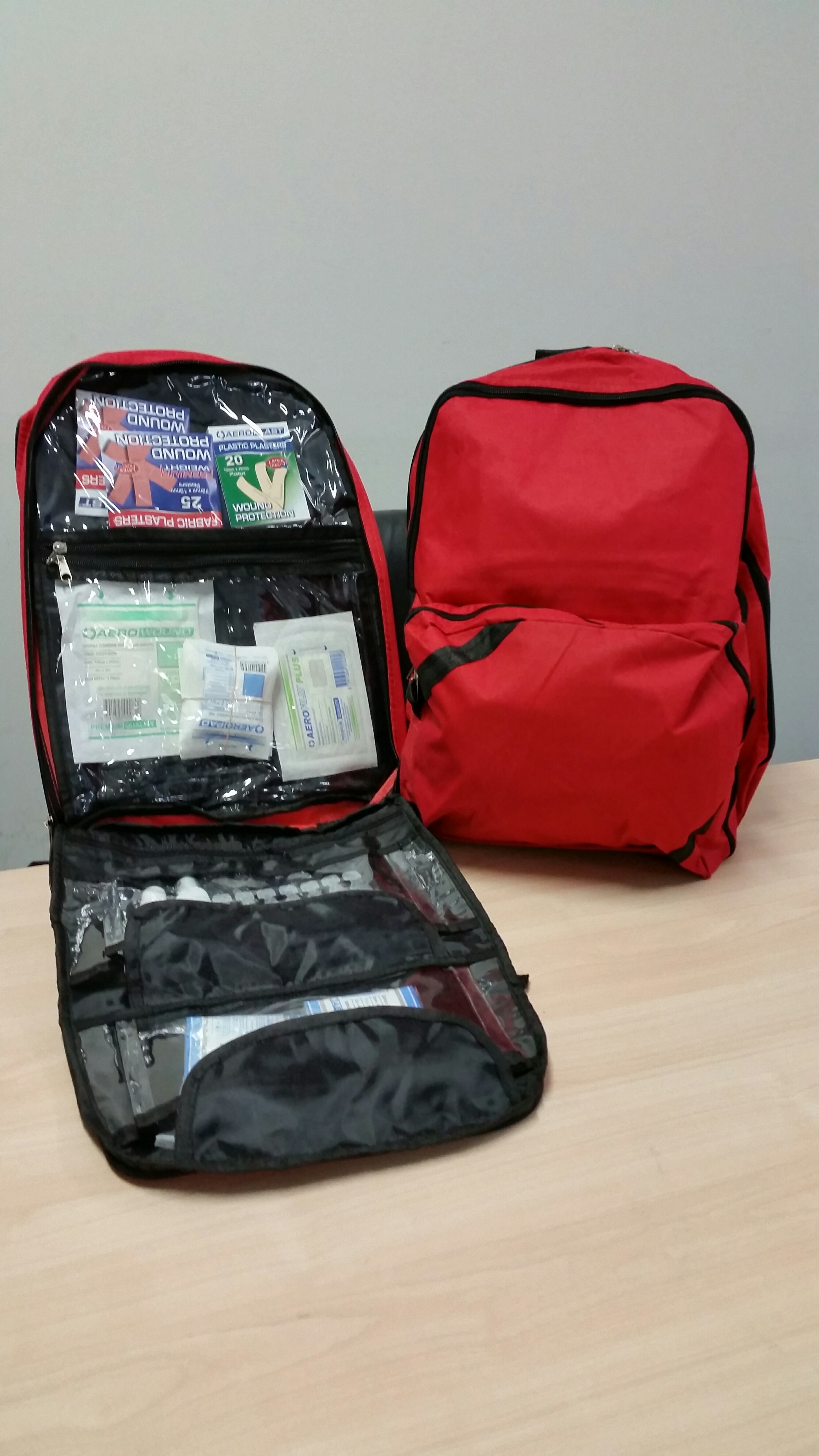 2012 General First Aid kit contents packed in a Red backpack First Aid kit.